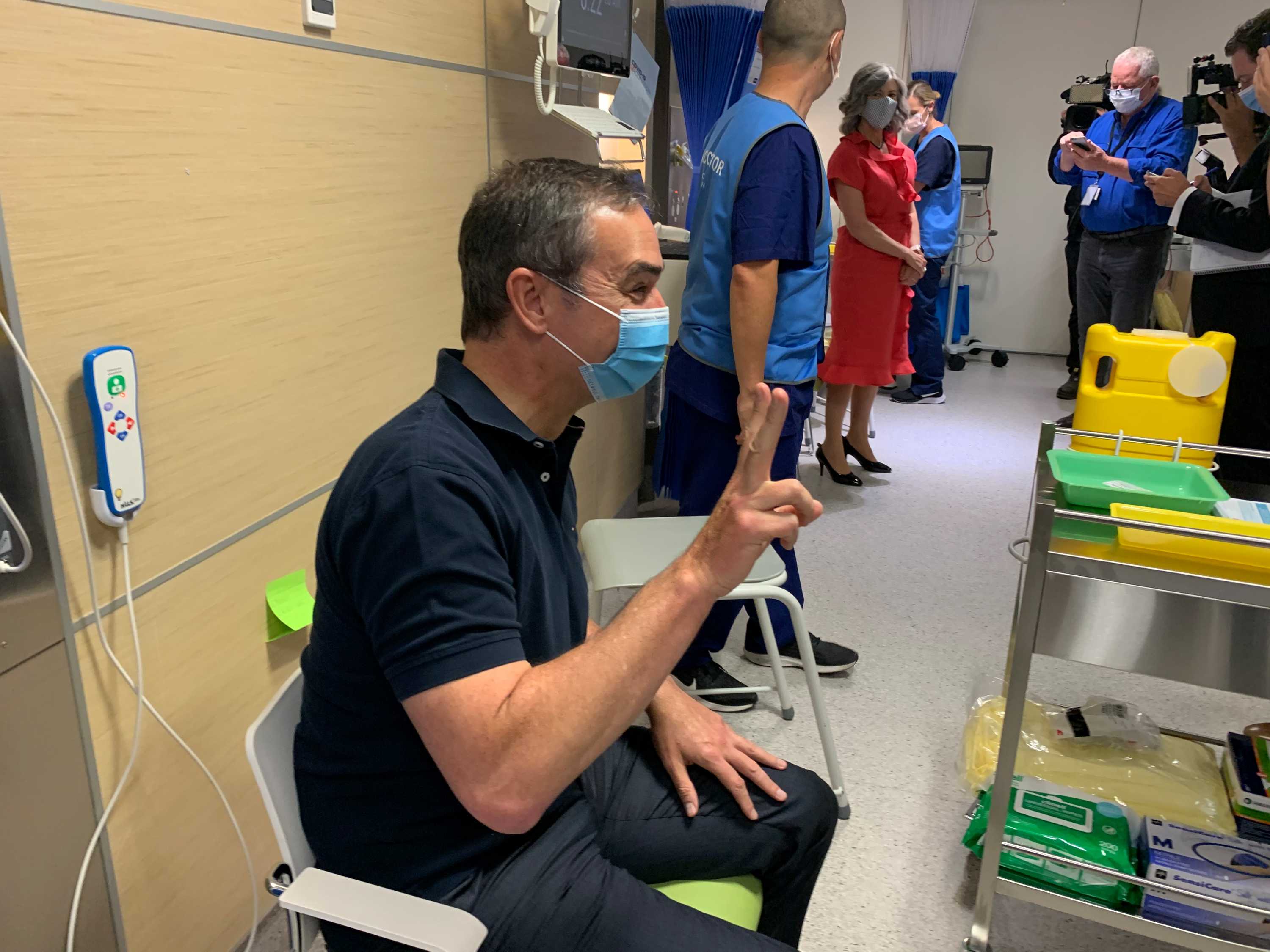 Steven Marshall is run the primary Pfizer vaccine in South Australia in 2021. (ABC Information: Brittany Evins)